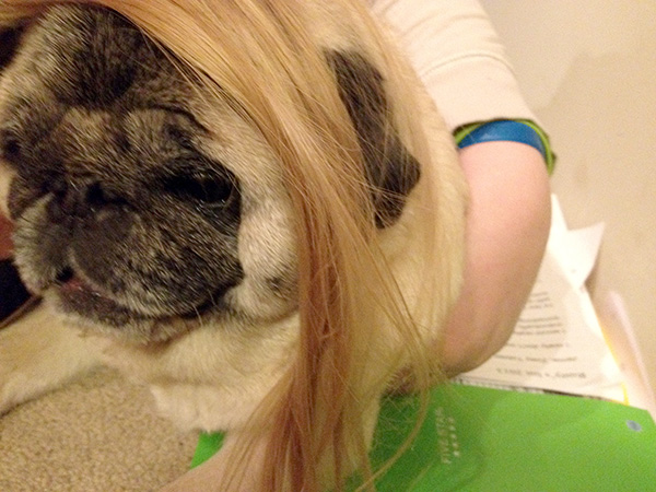 6) my daughter came downstairs to excitedly explain an organic chemistry eureka moment to me using her whiteboard, which really just confused me and lulled me to sleep. you can see my pug is alarmed that she is invading our space