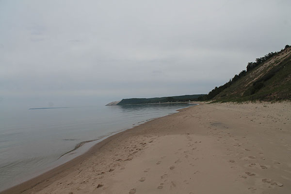 sleeping bear dune in the furthest distance, and south manitou island the dark line to the left of it